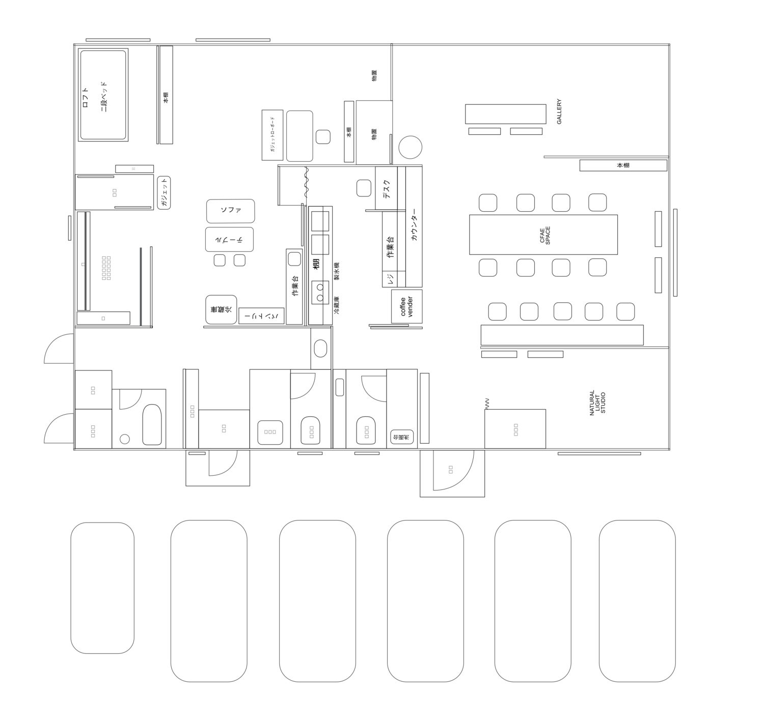 面積:117㎡(住居≈60㎡/カフェ・ギャラリー・スタジオ≈57㎡)